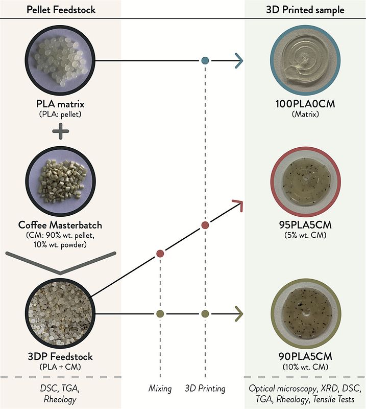 Paramatti, M., Romani, A., Pugliese, G., and Levi, M. 2024. PLA Feedstock Filled with Spent Coffee Grounds for New Product Applications with Large-Format Material Extrusion Additive Manufacturing. ACS Omega, Vol 9(6), 6423-6431. DOI: 10.1021/acsomega.3c05669