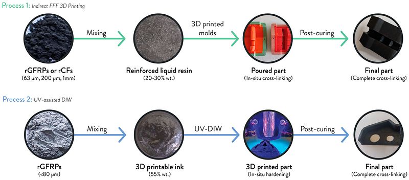 Polymer–matrix composites (PMCs) // Circular economy // Recycled fibers reinforced polymers (FRPs) // Indirect 3D printing // Direct Ink Writing // liquid deposition modeling // Design for additive manufacturing
