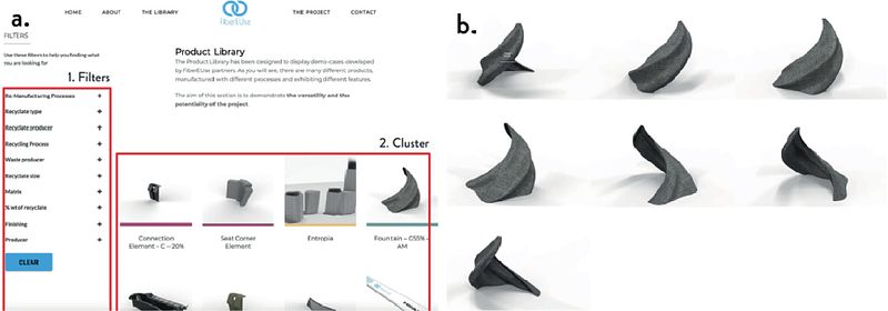 Currently the development of new circular materials has brought up the necessity to transfer their knowledge amongst the interested stakeholders for their real exploitation. This chapter aims to illustrate the design of a physical and virtual library system of the FiberEUse project. In particular, this library system wants to foster the development of new applications and value chains through the showcase of the new recycled composite materials and archetypal remanufactured products developed during the project. After the definition of the system concept, specific taxonomies were designed for the physical and virtual parts considering the technical properties and the expressive-sensorial qualities of the new recycled materials and products. A hierarchical organization was then designed to allow both tangible and intangible interactions with the samples, resulting in a coherent experience to explore these new recycled materials. Meanwhile, the physical exhibitors and the library website were developed to collect the physical and virtual samples. At the end, the whole system will be freely accessible through the library website and by booking a visit to the physical part. Thanks to its transdisciplinary nature, this system can stimulate the real exploitation of new value chains and applications. 1